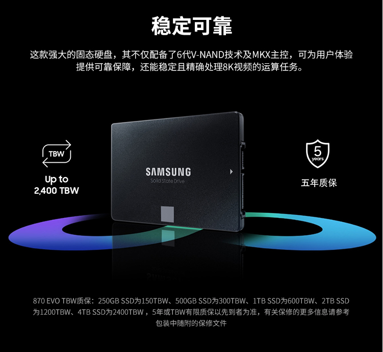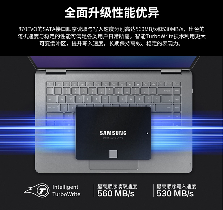 三星870 EVO 2T是使用的標準的SATA3接口,能夠兼容多種設備。并且這款固態(tài)硬盤還支持TurboWrite,即通過使用SSD中預先分配好的SLC緩沖區(qū),大幅提升寫入速度,在連續(xù)的數(shù)據(jù)傳輸過程中依舊能夠保持出色的性能表現(xiàn)。