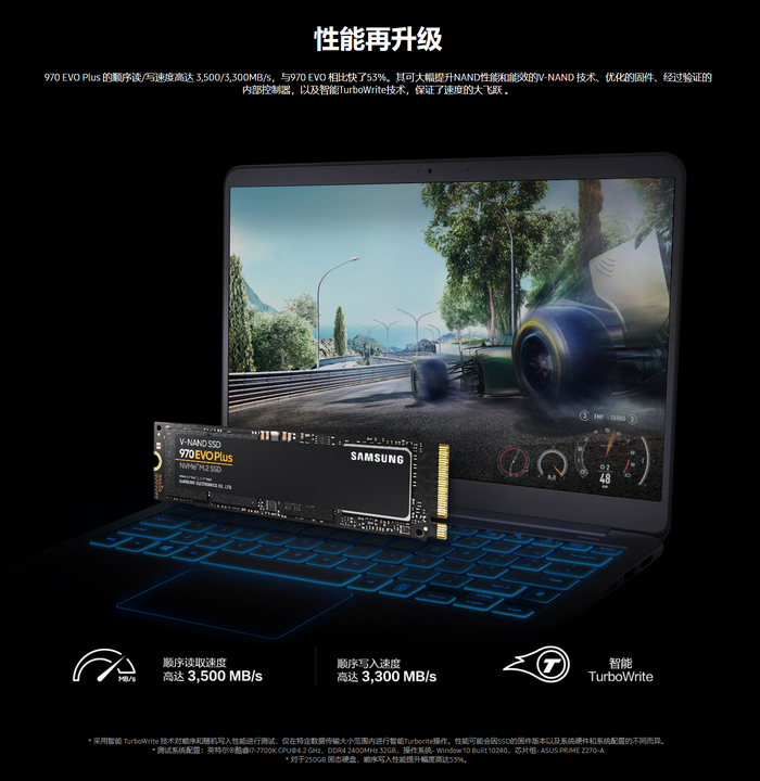 官方宣稱讀寫成績方面比970EVO的提升主要體現(xiàn)在寫入方面,順序讀取和寫入速度達到了3,500MB/S和3,300 MB/S,隨機讀寫速度600,000 IOPS和550,000 IOPS。