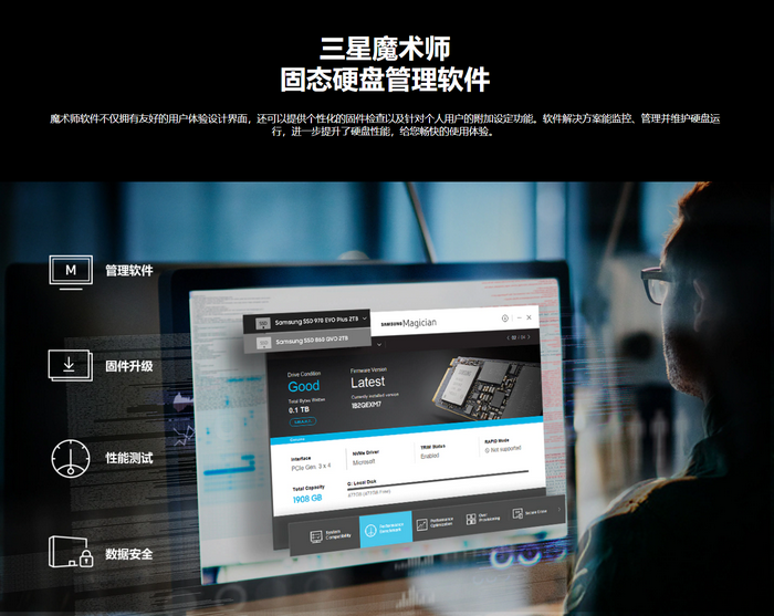 支持三星魔術師管理軟件,隨時能了解到你的硬盤所有信息,支持固件更新、性能優(yōu)化等,讓你的固態(tài)硬盤隨時保持在最高性能狀態(tài)。