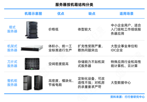 服務(wù)器可根據(jù)機(jī)箱結(jié)構(gòu)、CPU體系架構(gòu)、應(yīng)用層次、操作系統(tǒng)、用途等方面進(jìn)行分類(lèi)。從機(jī)箱結(jié)構(gòu)來(lái)看,服務(wù)器經(jīng)歷了從塔式、機(jī)架式、刀片到整機(jī)柜的發(fā)展演進(jìn),整機(jī)柜服務(wù)器作為面向大型數(shù)據(jù)中心的定制化服務(wù)器在近年興起。隨著服務(wù)器機(jī)箱結(jié)構(gòu)演化,服務(wù)器持續(xù)更新迭代,空間占有效率逐步提高,同時(shí)對(duì)機(jī)房散熱、承重、電力配置等也提出了更高的要求。
