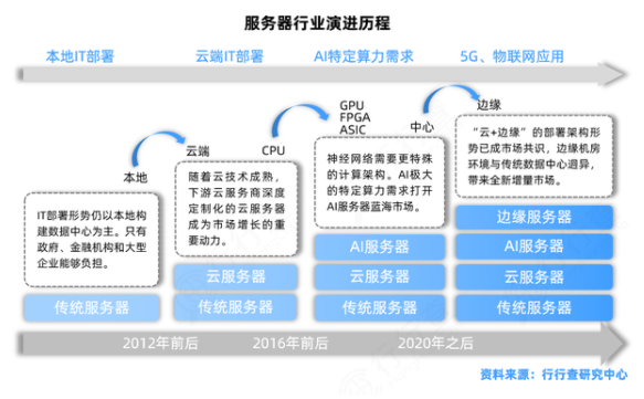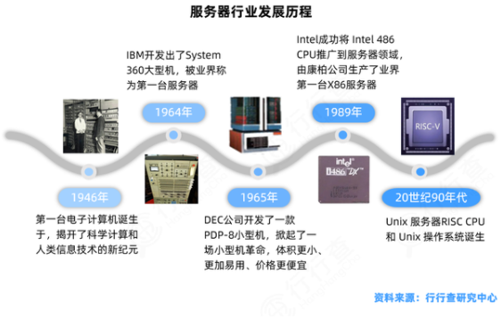 服務(wù)器行業(yè)的發(fā)展最早可追溯到1946年,世界第一臺(tái)電子計(jì)算機(jī)誕生,它揭開(kāi)了科學(xué)計(jì)算和人類(lèi)信息技術(shù)的新紀(jì)元。隨后,1964年IBM開(kāi)發(fā)出了System360大型機(jī),它是由5種功能強(qiáng)大的計(jì)算機(jī)所組成的系列,被業(yè)界稱(chēng)為第一臺(tái)服務(wù)器。今天的小型機(jī)是指計(jì)算機(jī)技術(shù)發(fā)展到90年代,由原來(lái)的大型機(jī)衍生出來(lái)的一種針對(duì)中小企業(yè)低成本的Unix服務(wù)器,這類(lèi)服務(wù)器通常采用RISCCPU和Unix操作系統(tǒng),因此國(guó)外將其分類(lèi)為UnixServer。伴隨著新興信息技術(shù)的發(fā)展,服務(wù)器行業(yè)也在同步演進(jìn)。2012年,云計(jì)算技術(shù)改變了服務(wù)器的部署方式,企業(yè)IT建設(shè)由本地轉(zhuǎn)向云端。2016年,Alpha Go掀起人工智能科技的第三次浪潮,由此帶來(lái)對(duì)新型架構(gòu)服務(wù)器的需求。到了2020年,5G通信技術(shù)打開(kāi)了邊緣計(jì)算的藍(lán)海市場(chǎng),由于機(jī)房環(huán)境的迥異,服務(wù)器將迎來(lái)全新增量市場(chǎng)。