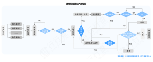 通用服務(wù)器具體業(yè)務(wù)流程包括研發(fā)、采購(gòu)、制造、銷(xiāo)售、技術(shù)服務(wù)等環(huán)節(jié)。國(guó)內(nèi)服務(wù)器品牌廠商的制造周期在2-5天左右,即單位產(chǎn)品從流水線作業(yè)開(kāi)始到制造完成并入庫(kù)的過(guò)程。其生產(chǎn)過(guò)程中所涉及的SMT表面組裝技術(shù)(Surface Mounted Technology )是目前電子組裝行業(yè)里最流行的一種技術(shù)和工藝。