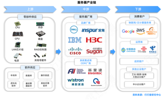 服務(wù)器產(chǎn)業(yè)鏈的上游廠商主要為電子元件廠商及軟件提供商,中游為服務(wù)器廠商,下游客戶則包括數(shù)據(jù)中心、政府、各類(lèi)企業(yè)等。