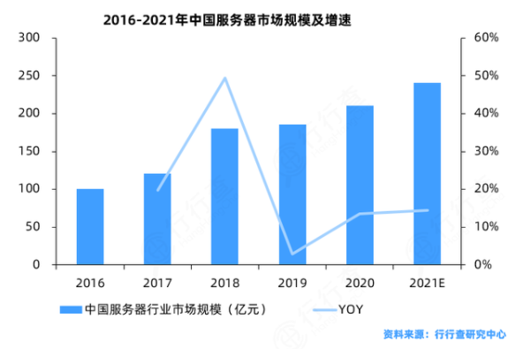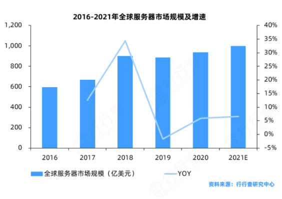 2016年至2018年,移動(dòng)互聯(lián)網(wǎng)流量爆發(fā)推動(dòng)服務(wù)器行業(yè)市場(chǎng)規(guī)??焖僭鲩L(zhǎng)。2019年下游互聯(lián)網(wǎng)廠商需求進(jìn)入存量消化期,全球市場(chǎng)出現(xiàn)一定程度的供給過(guò)剩,導(dǎo)致全球服務(wù)器市場(chǎng)增速大幅下滑,行業(yè)景氣度陷入低谷。根據(jù)行行查數(shù)據(jù)顯示,2020年全球服務(wù)器銷(xiāo)售收入約為900億美元,同比增長(zhǎng)6%,全球服務(wù)器出貨量超過(guò)1100萬(wàn)臺(tái),同比減少近45%。國(guó)內(nèi)市場(chǎng)方面,2016年至2020年我國(guó)服務(wù)器行業(yè)市場(chǎng)規(guī)模從100億元增長(zhǎng)至210億元,復(fù)合增長(zhǎng)率為超過(guò)20%,增速領(lǐng)先全球市場(chǎng)。隨著云計(jì)算、AI等新興應(yīng)用的興起,全球范圍內(nèi)的數(shù)據(jù)中心需求持續(xù)增長(zhǎng),服務(wù)器作為數(shù)據(jù)中心成本中重要的部分,其市場(chǎng)規(guī)模也得以快速擴(kuò)張。
