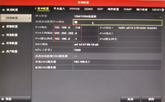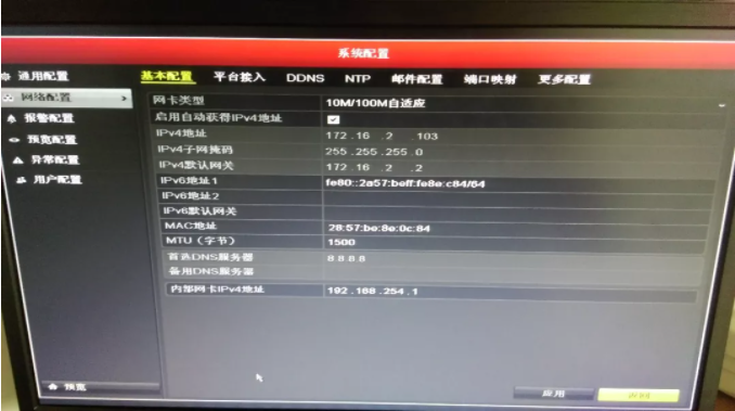 ①顯示器畫面鼠標(biāo)右鍵–主菜單–系統(tǒng)配置,點(diǎn)擊網(wǎng)絡(luò)配置,進(jìn)入基本配置中,把自動(dòng)獲取IPV4后邊的√去掉,手動(dòng)輸入IP地址(如圖1),點(diǎn)擊應(yīng)用。