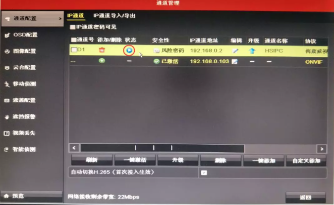 ②返回選擇“主菜單 → 通道管理 →通道配置”。 進(jìn)入通道管理的界面,在通道配置里面,點(diǎn)擊刷新,會(huì)搜索到同一局域網(wǎng)的攝像機(jī),再點(diǎn)擊“一鍵添加”或者通道列表的“+”添加,添加成功后顯示藍(lán)色狀態(tài)(如圖2)。