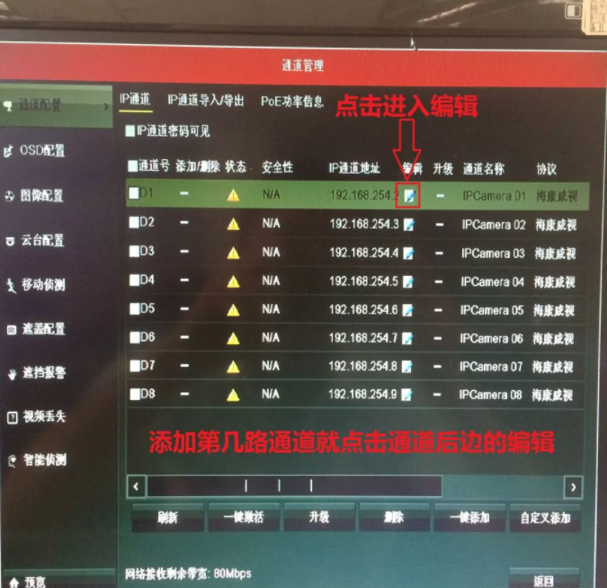 2.進(jìn)入通道管理,要添加哪一路通道就點(diǎn)擊默認(rèn)Ip后邊的編輯,進(jìn)入編輯添加設(shè)備,IP地址 192.168.1.XX 最后一位數(shù)不要一致,否則會(huì)IP地址沖突。