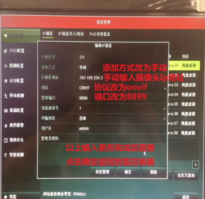 3.進(jìn)入編輯后把添加方式改為手動(dòng),手動(dòng)輸入攝像頭改好的Ip地址,協(xié)議改成通用的onvif協(xié)議,端口改為80或8899,密碼是攝像頭的密碼,以上輸入完成后直接點(diǎn)擊點(diǎn)確定進(jìn)行保存,然后返回監(jiān)控畫面。