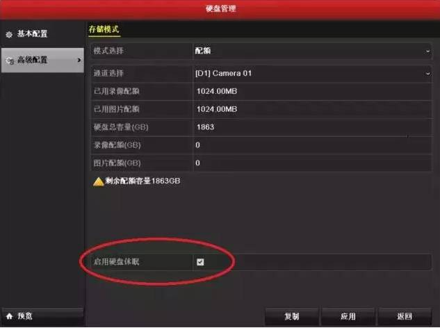 在“主菜單 → 硬盤管理 → 高級配置”界面,可以選擇是否啟用硬盤休眠功能,默認(rèn)情況是勾選“啟用硬盤休眠”的。