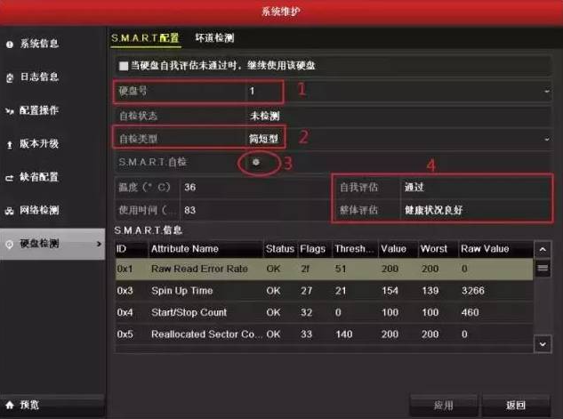 1. 選擇“主菜單→系統(tǒng)維護(hù)→硬盤檢測”,進(jìn)入硬盤檢測的“S.M.A.R.T配置”界面。