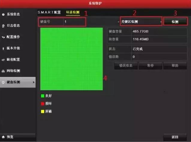 ??涤脖P錄像機(jī)的硬盤檢測功能支持“S.M.A.R.T檢測”和“壞道檢測”。