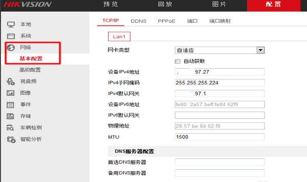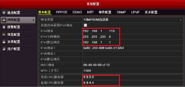 2、點(diǎn)擊網(wǎng)絡(luò)——基本配置——TCP/IP,這里可以用電腦設(shè)置錄像機(jī)的IP、掩碼和網(wǎng)關(guān)了。