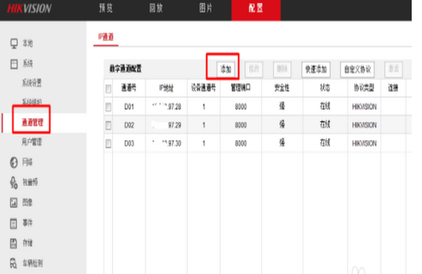 3、設(shè)置完這里之后,錄像機(jī)是要錄像的, 需要添加監(jiān)控?cái)z像頭,我們?cè)谙到y(tǒng)——通道管理 ,添加攝像頭。