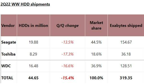 數(shù)據(jù)顯示:2022年第二季度全球機(jī)械硬盤出貨量?jī)H為4465萬(wàn)塊,環(huán)比下滑15.4%。三大廠希捷、東芝和西部數(shù)據(jù)均出現(xiàn)兩位數(shù)的跌幅,其中,希捷市場(chǎng)份額達(dá)到44.5%,出貨1988萬(wàn)塊,環(huán)比下降13.5%。