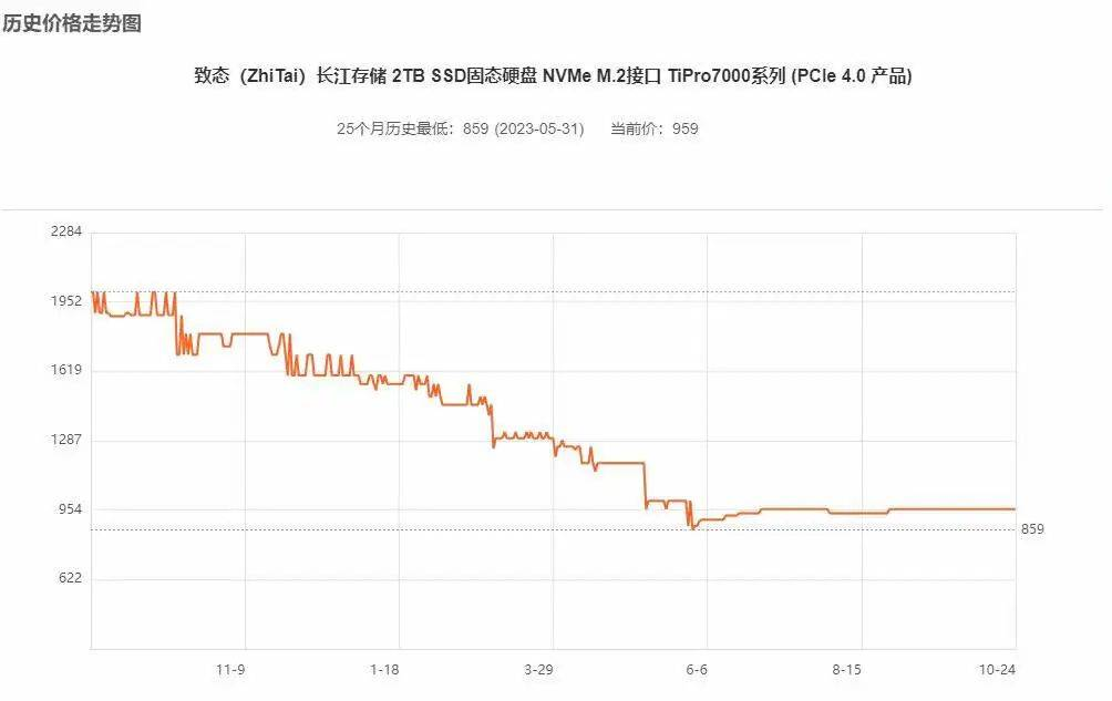 再來看國內(nèi)長存旗下的致態(tài)品牌,同樣是旗艦級PCIe 4.0固態(tài)硬盤產(chǎn)品TiPro7000,2TB容量在雙十一售價為959元,對比618期間的859元正好漲了100元,并從大概8月下旬開始調(diào)升價格。