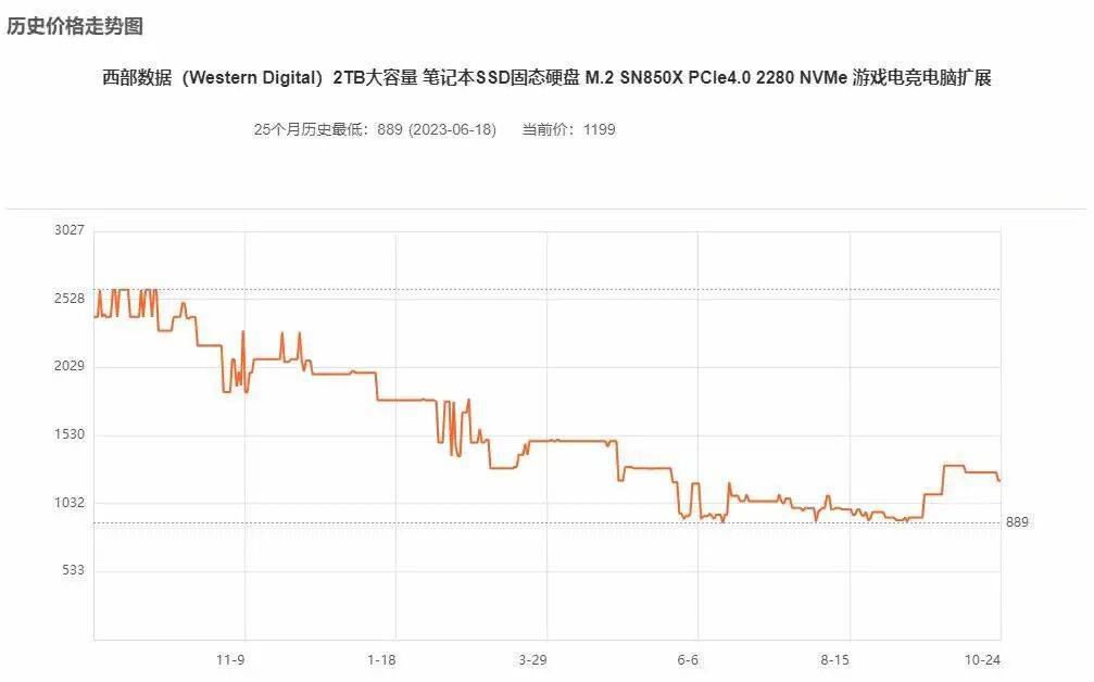 作為西部數(shù)據(jù)標桿PCIe 4.0產(chǎn)品的SN850X,2TB容量雙十一價格也漲到了1199元,比618期間的889元更是漲了310元,而從走勢圖也能明顯看出,從10月開始有明顯的提價行為。