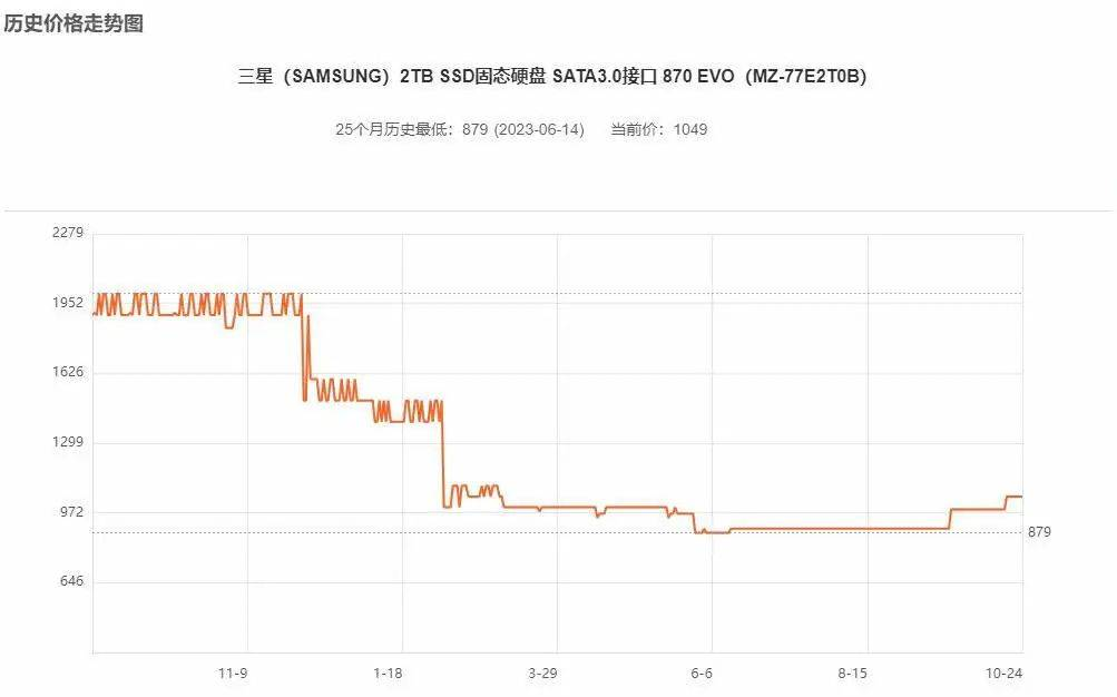 不僅是PCIe固態(tài)硬盤,SATA固態(tài)同樣出現(xiàn)了不同程度的漲價,仍以2TB容量為例,三星870 EVO雙十一價格為1049(竟然比大多數(shù)PCIe 4.0固態(tài)硬盤還高),而其618期間的售價為879元,也就是說漲了170元。