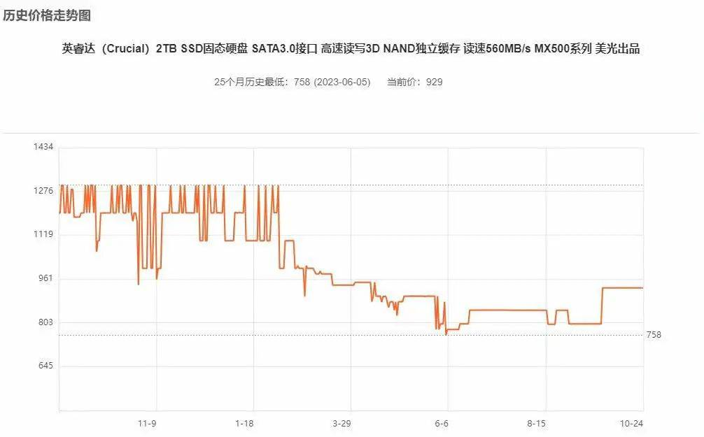 美光旗下的英睿達品牌,其2TB的SATA固態(tài)硬盤MX500雙十一價格為929元,618期間則為758元,漲價171元,與三星870 EVO差不多。且兩款產(chǎn)品均從10月份開始提價。