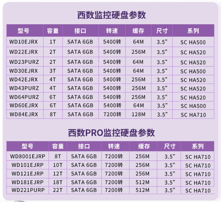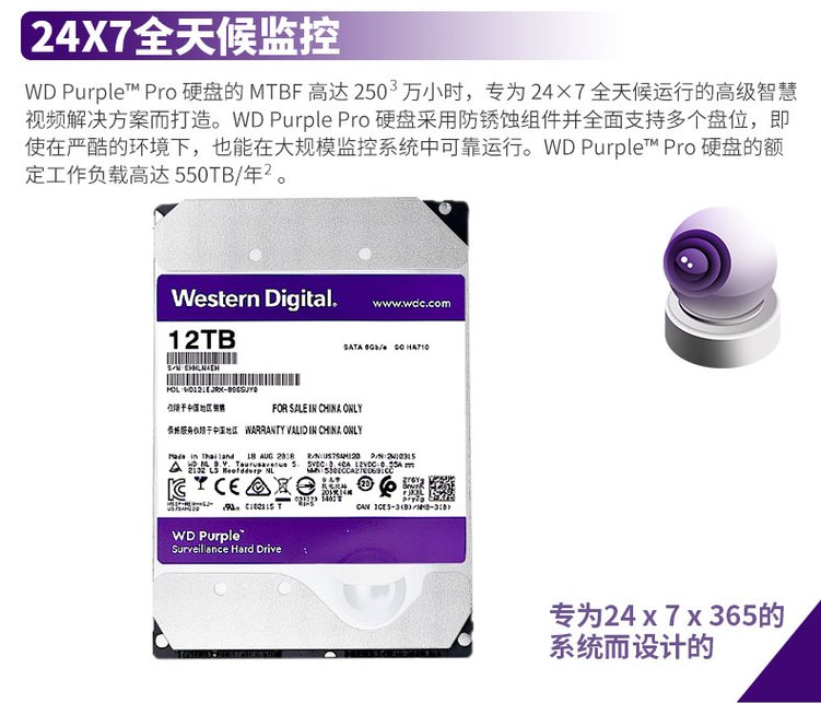 西數(shù)HA710 12TB紫盤PRO WD121EJRP監(jiān)控級硬盤擁有7200轉高轉速,配備高性能和高工作負載,帶來高達250萬小時平均無故障工作時間,適合企業(yè)服務器級別用戶使用,質保5年。