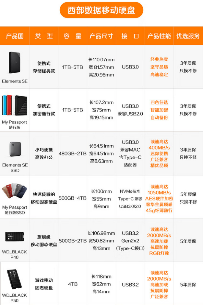 目前市面上主流西部數(shù)據(jù)移動硬盤主要有隨行SSD版、Elements SE新元素系列、Elements 新元素系列、輕薄多彩隨行版等。