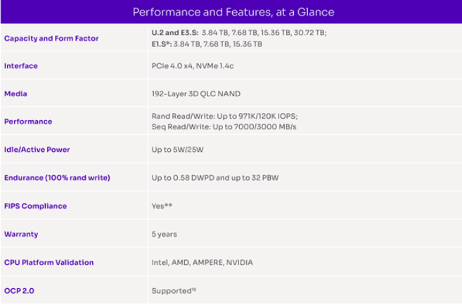 D5-5430系列產(chǎn)品采用PCIe Gen 4總線與QLC類型NAND顆粒,提供U.2 15mm、E1.S 9.5mm、E3.S 7.5mm等不同尺寸