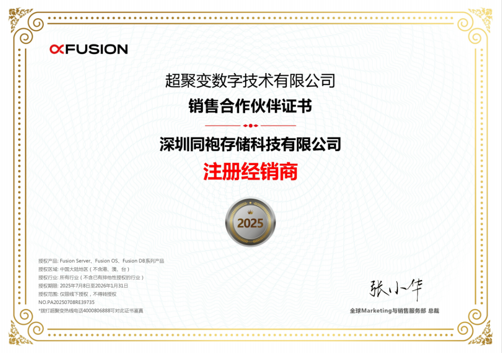 2025年7月,深圳同袍存儲(chǔ)科技有限公司正式獲得超聚變數(shù)字技術(shù)有限公司官方授權(quán),成為其全棧服務(wù)器產(chǎn)品線與解決方案的核心代理經(jīng)銷商。此次授權(quán)標(biāo)志著雙方在國(guó)產(chǎn)化算力基礎(chǔ)設(shè)施領(lǐng)域深度協(xié)同的戰(zhàn)略落地,為千行萬(wàn)業(yè)智能化轉(zhuǎn)型注入新動(dòng)能。