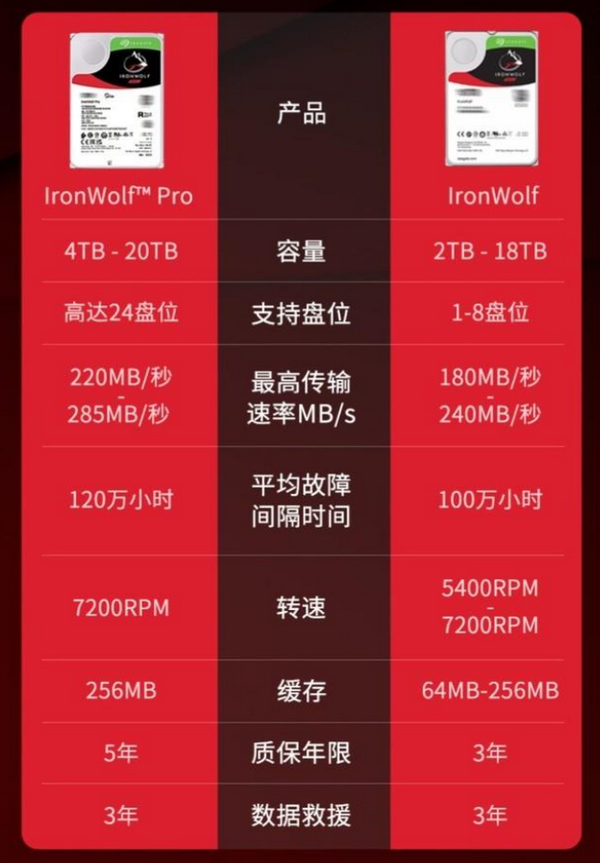 通過商品頁面可以看到,在諸如CMR技術(shù),AgileArray智能陣列技術(shù)和內(nèi)置旋轉(zhuǎn)振動(RV)傳感器等方面兩個系列是相同的,主要區(qū)別在于酷狼Pro系列全系采用256MB緩存,轉(zhuǎn)速為7200RPM,因此最高傳輸速率也比普通酷狼系列快了許多,并且官方的質(zhì)保年限也來到了5年。