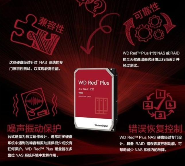 與希捷愛用動物為產(chǎn)品命名不同,西數(shù)更加喜歡直接用顏色進(jìn)行區(qū)分,而紅色正是西數(shù)的NAS硬盤所使用的顏色。不過更加復(fù)雜的是,西數(shù)給紅盤一口氣分了三種型號,分別是紅盤、紅盤Plus和紅盤Pro,不過普通紅盤采用的是SMR技術(shù),并且價格上已經(jīng)與紅盤Plus沒有什么區(qū)別,最高也只提供6TB容量,已經(jīng)沒有理由去選它了,因此這里重點(diǎn)介紹紅盤Plus系列。