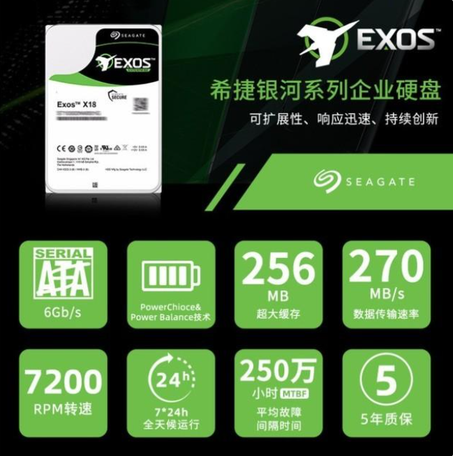 在這里向各位不差錢的土豪隆重推薦目前市場上的天花板,專為企業(yè)數(shù)據(jù)中心設(shè)計的氦氣硬盤。例如這款希捷Exos X18,它采用了九碟氦氣封裝,單碟容量2TB,轉(zhuǎn)速7200RPM,緩存為256MB,平均故障時間高達(dá)250萬小時,并且傳輸速率也高達(dá)270MB/s,數(shù)據(jù)負(fù)載量更是高達(dá)550TB/年。