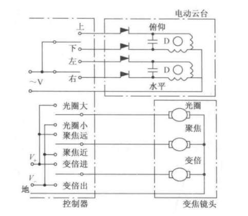 在攝像機離控制室比較近的情況下,通常可采用10芯電纜,云臺兩個交流電機需加AC220V或AC24V;鏡頭三個直流電機可加DC3~12V,將它們加到電機的控制線上。這種用多芯電纜傳送電動云臺和變焦鏡頭的控制電壓的優(yōu)點是,原理簡單,工作可靠;但其缺點是,浪費線材,且有很多能量消耗在傳輸電纜上,只適于近距離使用。